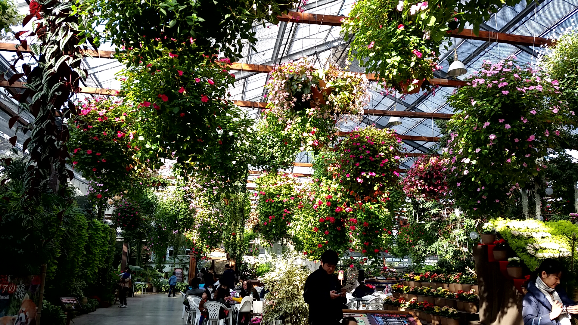 レストランスペースの頭上にはたくさんの花の鉢が吊ってあり、花を眺めながら食事ができます。